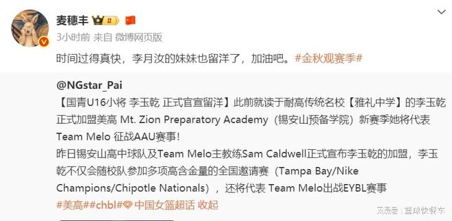最近几年,中国女篮球员留洋已经不是什么新鲜事情了。像李月汝、李梦、韩旭、杨力维等人,他们都曾先后前往WNBA联赛效力。而李月汝本人更是在海外联赛站稳脚跟,甚至已经开始收购海外联赛球队。作为李月汝的妹妹,李玉乾在代表中国女篮征战U16亚青赛后,她也做出了一个重要决定,她将效仿姐姐李月汝,前往美国高中联赛效力,这对于中国女篮而言,无疑是一个巨大的好消息。