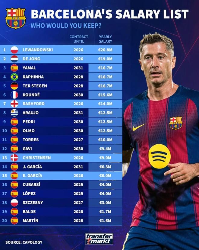 北京时间10月10日,德转列出了巴塞罗那队内的球员年薪,莱万多夫斯基以2080万欧元排名第一,弗朗基-德容1900万欧元排名第二,亚马尔、拉菲尼亚以及特尔施特根同以1670万欧元并列第三位。